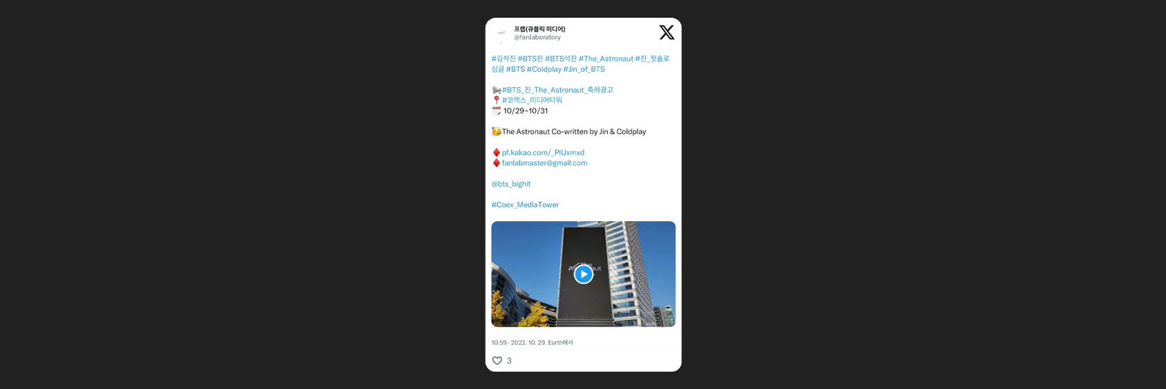 에서 BTS 진의 'The Astronaut' 발매 기념 영상 광고를 진행했습니다.